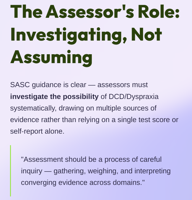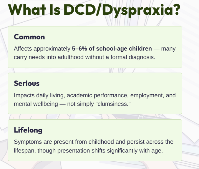 apply the current UK definition of DCD/Dyspraxia (aligned to international consensus) in your thinking and reporting